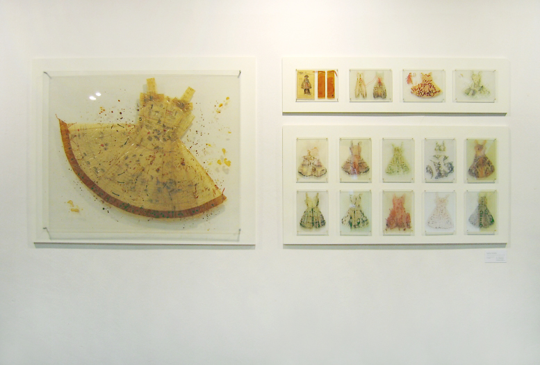 Die Arbeiten wurden im Rahmen der Schauspielproduktion "Der Eingebildete Kranke" (Molière) im Theaterfoyer des "kreartell" gezeigt. Die Falterkleider sind inspiriert von Robert Musils Text "tangle foot" – ein Fliegenpapier, das Sinnbild für Krieg und Todeskampf ist. Dieser Krieg geht unter die Haut, unter die Hülle – unter das Körperkleid. So erinnern die Schnittbogenlinien auf dem Vogue-Kinderkleid an strategische Skizzen von Schlachtplänen. Das pergamentene Papierkleid selbst ist Schauplatz des Todes und als Falterkleid zugleich auch Sinnbild für Auferstehung.